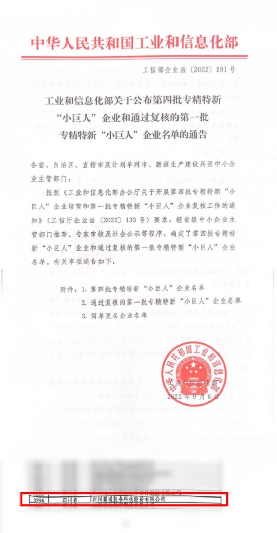 近日,國(guó)家工業(yè)和信息化部公布了第四批國(guó)家級(jí)專(zhuān)精特新“小巨人”企業(yè)名單,四川蜀道裝備科技股份有限公司榮獲國(guó)家級(jí)專(zhuān)精特新“小巨人”企業(yè)稱(chēng)號(hào),這是繼公司獲得2021年度四川省“專(zhuān)精特新”中小企業(yè)稱(chēng)號(hào)后,成功增添一項(xiàng)國(guó)家級(jí)的榮譽(yù)。不僅標(biāo)志著蜀道裝備公司自主創(chuàng)新能力和技術(shù)研發(fā)實(shí)力得到了國(guó)家和行業(yè)的高度認(rèn)可,更標(biāo)志著蜀道裝備公司發(fā)展邁上新臺(tái)階,迎來(lái)新征程。